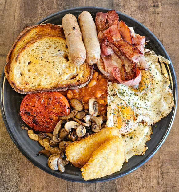 Grilled tomato, baked beans, sausages, grilled mushrooms, choices of eggs (Fried, poached, scrambled)