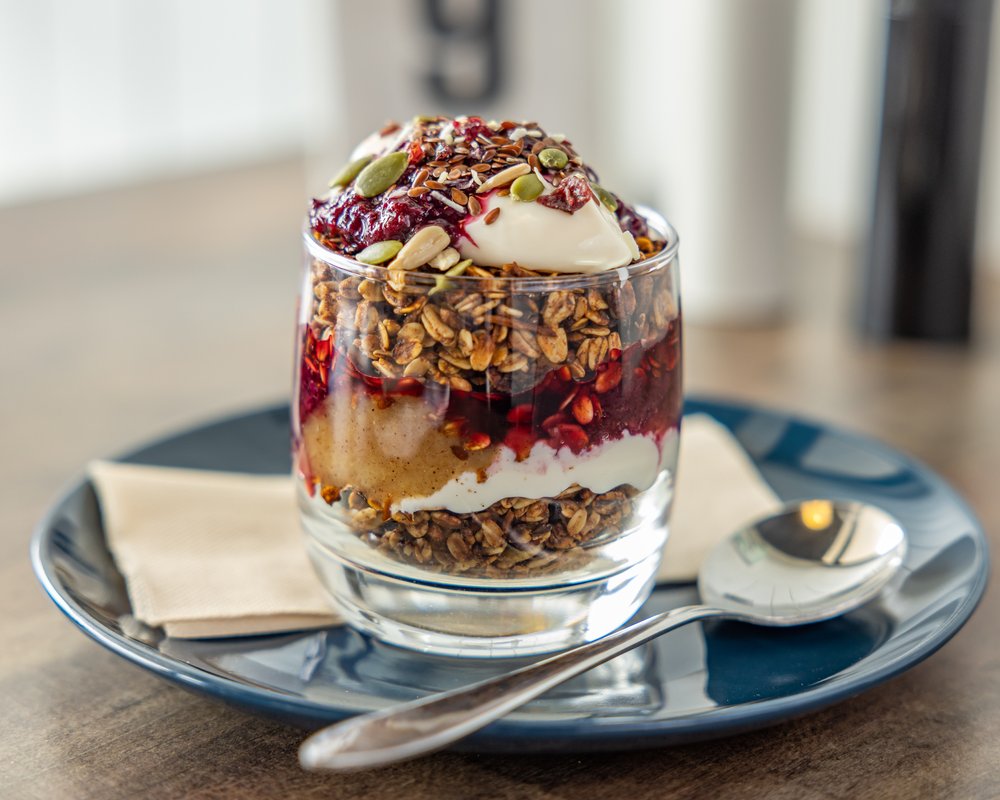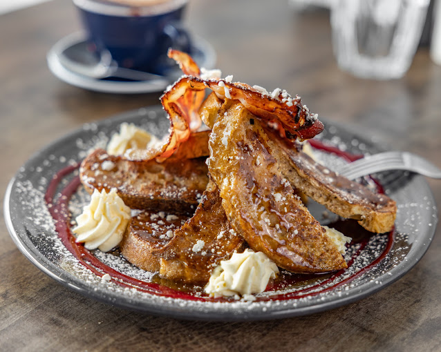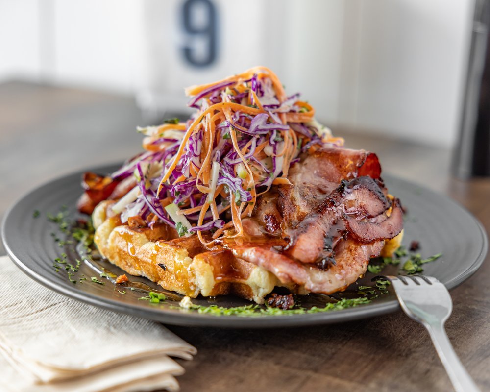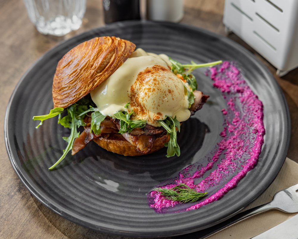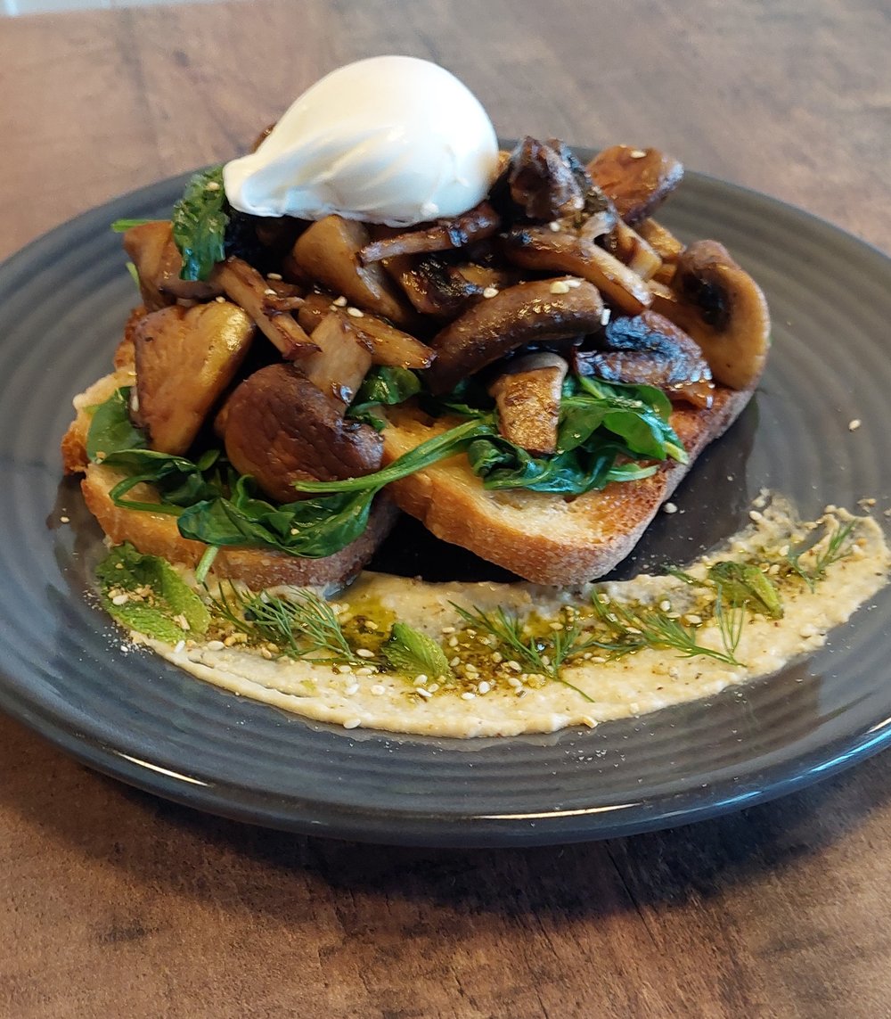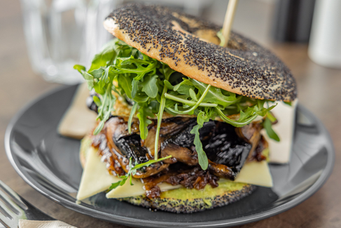Toasted poppyseed bagel, smashed avocado, caramelised onions, cheese, easy over fried egg, chili caramel, fresh rocket.