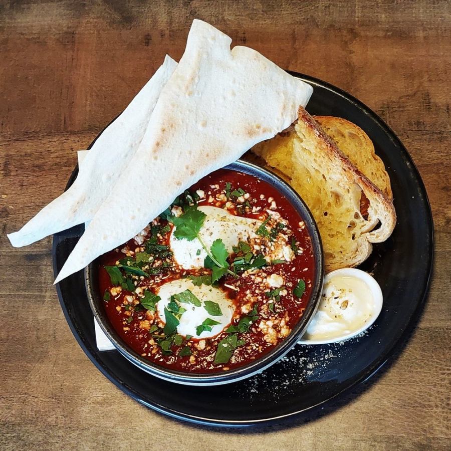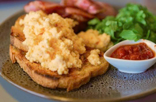 Two eggs on toast (Choice of scrambled, fried & poached), house tomato relish, fresh rocket.